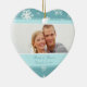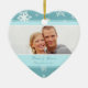 Ornement de photo de mariage d'hiver personnalisable avec votre propres photo et date de mariage de mariage dans le bleu et le blanc de turquoise élégant avec le motif de fête de flocons de neige. Un cadeau élégant de Noël pour la famille et les amis ou pour décorer votre arbre ou maison de Noël pour les vacances. La manière parfaite de se rappeler votre jour du mariage d'hiver.