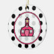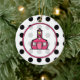Un ornement de Noël de professeur comportant un arrière - plan de pois noir au-dessus de blanc sur l'avant. Logo rose d'école à l'intérieur de cadre rose.