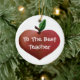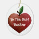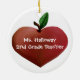 Ornement en céramique rond doux avec l'illustration graphique d'une pomme en forme de coeur, des deux côtés. Le texte lunatique blanc lit, au meilleur professeur, sur l'avant, et personnalisé, avec le nom de professeurs et le texte supplémentaire, sur le dos. Personnalisez le texte pour lire quelque chose que vous voulez. Grand ornement d'arbre de Noël que n'importe quel professeur appréciera.