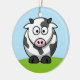 Une jolie vache caricaturale sur un ornement rond. Le revers de l'ornement montre la queue de la vache.