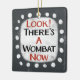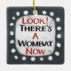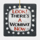Un dessin typographique irrévérencieusement bizarre qui dit "Regarde ! Il y a A Wombat Now". Il présente du texte noir et rouge sur un rectangle blanc avec des points blancs amusants et amusants qui l'entourent, le tout sur un arrière - plan gris.