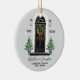 Doté d'un arrière - plan neigeux gris pâle et d'une scène de porte d'entrée comprenant des arbres de Noël et une couronne avec un arc en vichy plaid rouge, cet ornement de Noël correspond à notre collection Home For the Holidays. Cet ornement de conservation en céramique est parfait pour les jeunes mariés ou un couple célébrant leur premier Noël ensemble dans une nouvelle maison ou un appartement! Le dos est recouvert d'une en vichy plaid en rouge.