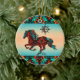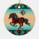 Personnalisez cet ornement de Noël de l'un des genres du sud-ouest du cheval! Il comprend un cheval du sud-ouest Galloping Under the Sun sur un Arrière - plan de soleil turquoise et orange...Entouré de Turquoise, Orange et Black Borders! Design D'Art Original Par L'Artiste Kerry Miller.