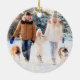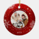 Créez un ornement photo moderne et festif en rouge avec des flocons de neige blancs et personnalisé avec un titre personnalisé, photo et noms et année sur le devant et une photo à fond sur le dos. Contactez le concepteur via Zazzle Conversation ou makeitaboutyoustore@gmail.com si vous souhaitez modifier ce design ou sur un autre produit.