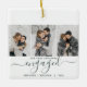 Commémorez votre fiançailles avec ce magnifique ornement de gardien moderne. Le texte vert foncé dit "Notre premier Noël engagé", avec le mot "engagé" dans un élégant script d'écriture manuscrite avec des fioritures avant et après. Remplacez les trois exemples d'images par vos photos verticales préférées, et ajoutez vos noms et l'année en vert foncé sur un arrière - plan blanc.