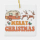 Camping Joyeux Noël Reindeer Typography Ornament présente le texte "Joyeux Noël" dans une typographie rétro avec une caravane décorée festive tirée par des rennes et accentuée de flocons de neige et de saints. Conçu par Evco Studio www.zazzle.com/store/evcostudio