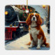 A nostalgic and heartwarming Christmas painting of a Cavalier King Charles Spaniel waiting at a snowy train station. Perfect for those who love vintage holiday charm and timeless festive art.