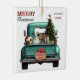 Un pick-up bleu turquoise porte un arbre de Noël décoré et des colis cadeaux sur ce joli ornement de Noël en verre. En regardant de la porte arrière est un beau chien dalmate. Un panneau en bois rustique sur le pare-chocs arrière dit "Cheer de Noël". Le texte stylisé rouge et vert en haut à gauche dit "MERRY CHRISTMAS", avec votre nom (ou celui de votre chien) et l'année à droite. Les deux camps ont la même image.