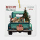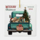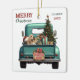 Un pick-up bleu turquoise porte un arbre de Noël décoré et des colis cadeaux sur ce joli ornement de Noël en verre. En regardant de la hayon arrière est un beau coq Spaniel chien couleur bouffon. Un panneau en bois rustique sur le pare-chocs arrière dit "Cheer de Noël". Le texte stylisé rouge et vert en haut à gauche dit "MERRY CHRISTMAS", avec votre nom (ou celui de votre chien) et l'année à droite. Les deux camps ont la même image.