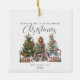 Illustration d'une maison de fée à bosses d'arbres décorée pour Noël avec deux arbres, des lampes de Noël et une lanterne. Texte dit, "Je vous souhaite un joyeux Noël fée" Personnalisez avec le nom et l'année.