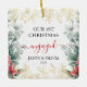 Célébrez le 1er jour férié joyeux de votre fiançailles avec une photo personnalisée 1 de "Notre premier Noël Engagé" carré de la verdure monoline ornement céramique fleur. Ce design présente une verdure de Noël aquarelle élégante avec des fleurs de monoline d'or, calligraphie de style manuscrit, les noms et l'année du couple, et une photo de votre choix. Cette tenue mariage unique ajoute une touche élégante à la décoration de la maison de Noël.