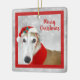 Greyhound Christmas -Un faon rouge et blanc gris vêtu d'un chapeau de Père Noël rouge et d'un collier rouge posé sur un arrière - plan de neige en bokeh gris argent. encadré d'un cadre carré rouge. Joyeux Noël en caractères rouge peut être personnalisé avec votre message.