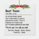 Montrez votre appréciation pour une équipe extraordinaire avec cet ornement personnalisé de la meilleure équipe. Conçu avec une définition amusante de style dictionnaire, cet ornement célèbre la collaboration, le travail acharné et le succès. Vous pouvez le customiser avec un nom ou un message pour le rendre encore plus spécial. Cet ornement est une façon réfléchie d'exprimer la gratitude et la motivation de l'express, parfait pour les cadeaux de collègues, la reconnaissance des employés, les célébrations de bureau ou les cadeaux de remerciement d'équipe. Il est idéal pour les patrons, les gestionnaires, les collègues ou les amis de travail qui font chaque jour mieux.