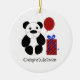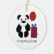 Un mignon ours de panda tenant un ballon rouge, un emballage rouge avec un arc bleu à côté de lui. Le mot "félicitations" peut être changé à votre gré. Un doux sentiment pour un ornement d'ours d'anniversaire.