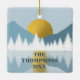 Un beau design mettant en valeur une forêt recouverte de neige, un paysage de montagne et un coucher ou lever de soleil doré se reflétant dans l'eau. Les tons de couleur sont neutres comme le bleu, le blanc et l'or. Un design rustique idéal pour la décoration d'une maison d'hiver et la saison des fêtes.