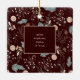 Ce simple ornement photo de Noël présente "Joyeux Noël" dans un élégant script moderne et texte personnalisé pour votre nom de famille. L'arrière offre un motif boho hiver verdoyant apparaissant dans des tans et des teals doux sur un arrière - plan bordeaux foncé profond et offre un texte supplémentaire pour les prénoms des membres de votre famille.