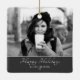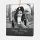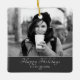 Script Festif Moderne Photo personnalisée Ornement en céramique de vacances. L'ornement est en blanc, noir et gris - avec photo, voeux de Joyeux vacances, votre note personnelle et un numéro d'année en écriture blanche tendance. Insérez votre photo préférée dans le modèle - noir et blanc photo correspond très bien avec le design. Personnalisez cet ornement avec votre nom et votre numéro d'année. C'est un design idéal pour les familles, les couples ou les célibataires. Idée cadeau de Noël parfaite pour vos amis et votre famille ou pour vous-même.