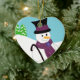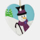 Un mignon bonhomme de neige portant un casquette noir et tenant une canne, une expression douce sur son visage.