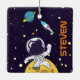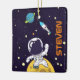 Un ornement personnalisé avec un arrière - plan bleu foncé aux étoiles jaunes éparpillé un peu partout. Couché sur le dessus est l'illustration d'un astronaute vêtu d'une combinaison blanche flottant au-dessus de la lune. Au loin se trouve une planète avec des anneaux et un vaisseau-fusée qui s'envole dans le ciel à la recherche de nouveaux mondes à explorer.