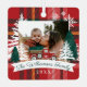 Ferme rustique arbres de Noël frais famille deux photo-gardien de l'ornement en métal. L'ornement peut être customisé avec le nom de famille, l'année, monogramme, et photo sur le devant et le dos. Arrière - plan en damier rouge avec pins rustiques et flocons de neige et notre camion vintage en aquarelle rouge dessiné à la main portant un sapin de Noël. Le nom de famille est affiché sur une bannière blanche. Oeuvre de Moodthology Papery.