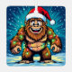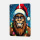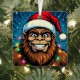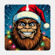 A funny Bigfoot Christmas metal ornament with a comic book style pop art sasquatch smiling with a Santa and Christmas lights on. Each side has a different Sasquatch.