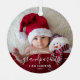 Aidez-les à célébrer leur premier petit-enfant avec ce magnifique ornement moderne de gardiens. Le texte blanc dit "Notre premier Noël en tant que grands-parents", avec le mot "grands-parents" dans un élégant script d'écriture manuscrite avec des fioritures avant et après. Remplacez facilement l'image de l'échantillon par votre photo préférée du nouveau bébé, et ajoutez son nom et l'année. Un filtre dégradé foncé permet de faire apparaître le texte.