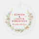 aquarelle en couronne d'hiver mariage photo personnalisée ornement à deux côtés. Personnalisez avec vos noms de mariée et de mariée et votre date de mariage. Parfait pour un cadeau mariage à thème de la baie ou du cône de pin, naturel ou d'hiver, ou après le cadeau mariage. Aquarelle de couronnes peint de cônes de pin, de baies, de saints, de mistletoe, de grevillea et d'étoiles jaunes dorées, art original et design par Sarah Trett pour www.mylittleeden.com