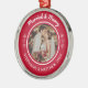 Cet ornement de Noël personnalisé présente un design moderne avec une police de caractères et des coeurs. Personnalisez le nom, l'année et la photo mariage. Ce modèle fonctionne le mieux avec une photo au format paysage avec le couple au centre.