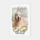 Créez un souvenir photo pour animal de compagnie garde saké ornement en métal carré d'un chien bien-aimé avec 2 photos (une de chaque côté) avec un design à boucle infinie incorporant une empreinte et un coeur de chien en or, noir et blanc. OPTIONS : Choisissez parmi d'autres formes et styles ornementaux sur la page de commande. ASSISTANCE : Pour obtenir de l'aide sur la modification ou la personnalisation de la conception ou le transfert de la conception à un autre produit, contactez le concepteur AVANT DE COMMANDER via l'onglet MESSAGE Conversation Zazzle ci-dessous ou envoyez un courriel à makeitaboutyoustore@gmail.com.