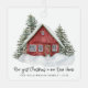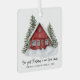 Rustic First Christmas New Home Woodland Photo Ornament - Un cabine de Noël rustique dans les bois avec de la neige est présenté sur notre ornement. joli texte manuscrit dit "Notre premier Noël dans notre nouvelle maison" et est personnalisé avec votre nom de famille et année. Le dos de l'ornement comporte une photo de votre famille, et l'adresse de votre nouvelle maison. Fait le cadeau parfait.