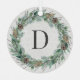 Elégant "Joyeux Noël" en métal rond ornement design de vacances dispose d'un chic rustique arrière - plan à grains de bois blanc avec une couronne de verdure d'hiver aquarelle encadrant un premier ou un nom de famille monogramme initial. Personnalisez le texte moderne et élégant vert et gris charbon de bois avec votre choix de salutation, nom de famille, et l'année.