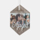 Célébrez le 1er jour férié joyeux de votre fiançailles avec un collage photo personnalisé 3 "Our First Christmas Engaged" en forme d'hexagone ornement en verre. Toutes les formulations et images de ce modèle sont simples à personnaliser. (CONSEIL EN MATIÈRE DE PLACEMENT D'IMAGE : Une façon simple de centrer une photo exactement comment vous voulez est de la rogner avant de la télécharger sur le site Zazzle.) En tant qu'idée, la typographie de script peut lire "Ensemble" ou "Marié". Le design moderne de la ferme comprend du faux bois brun rustique, de la calligraphie élégante, les noms et l'année du couple, et trois photos de votre choix. Cette tenue mariage unique ajoute une touche élégante à la décoration de la maison de Noël.