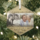 Célébrez un joyeux 50e anniversaire de mariage d'or avec une coutume 2 photo "Marié 50 ans" ornement de Noël en forme d'hexagone noir et or. Les images et tout le libellé de ce modèle sont simples à personnaliser. Le design est composé d'un arrière - plan en faux feuille d'or, d'une typographie de style art déco vintage, des noms et dates du couple et de deux photos de votre choix. Cette tenue mariage unique et moderne apporte une touche élégante à la décoration de la maison de Noël. Veuillez noter que l'or est imprimé en couleur et non en métal. Félicitations et joyeux cinquantième anniversaire !