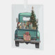 Un pick-up bleu turquoise transporte un arbre de Noël décoré et des colis cadeaux sur ce joli ornement de Noël en verre. En regardant hors de la porte arrière est un magnifique chien de bétail australien. Un panneau en bois rustique sur le pare-chocs arrière dit "Cheer de Noël".