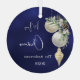 Un arrière - plan bleu inégal. Décoré de baubles blancs et dorés, un peu de verdure et un cône de pin. Personnalisez et ajoutez votre nom, année. Texte : Joyeux Noël