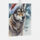 Cette scène hivernale a un magnifique loup portant un chapeau de Père Noël dans la neige.