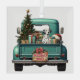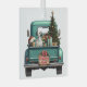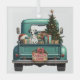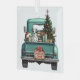 Un pick-up bleu turquoise porte un arbre de Noël décoré et des colis cadeaux sur ce joli ornement de Noël en verre. Vue de la porte arrière est un chien dalmate magnifique. Un casquette du Père Noël est assis sur l'un des paquets cadeaux, et un panneau en bois rustique sur le pare-chocs du dos dit "Cheer de Noël".