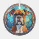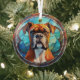 Voici un joli ornement en verre avec un thème de vitrail, avec un beau chien Boxer. Le chien est dressé contre un arrière - plan abstrait majoritairement bleu avec une bordure orange brune. Cela fait un bon rembourrage ou décoration pour la maison qui aime un Boxer.