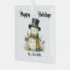 The design on this ornament is a whimsical, smiling snowman with a black top hat and a cheery yellow and blue plaid scarf. He is surrounded by foliage and birds.