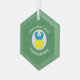 Soutenez l'Ukraine ce Noël avec cet ornement en forme d'hexagone pour votre décoration de Noël ou de vacances. Un arrière - plan vert de carrés grossiers tient un cercle blanc de carrés fractaux. A l'intérieur du cercle se trouve un ange blond aux cheveux portant le drapeau de l'Ukraine. Pour personnaliser, ajoutez un nom et une année, ou votre propre texte. L'ange de Noël du drapeau ukrainien dit SLAVA UKRAINI !