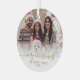 Elégant or et blanc Lettré "Joyeux Noël" Script de la famille de photos ornement. Comprend votre photo de famille préférée, "Joyeux Noël" calligraphie texte en écriture manuscrite, nom de famille et année. Facile à personnaliser. Conseil photo : recadrez votre photo sur le formulaire carré avant de la télécharger.
