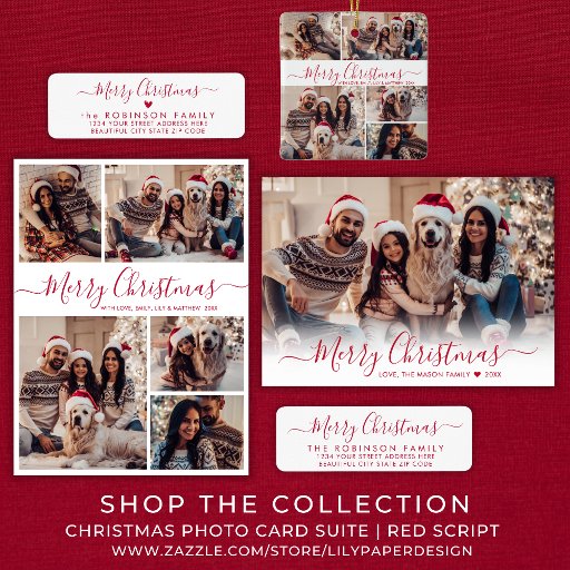 Ornement En Verre Élégant Rouge Script Famille Photo Joyeux Noël