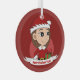 Ornement en verre avec l'illustration d'une jolie fille souriante avec de longs cheveux marron, elle porte un costume de Père Noël rouge et blanc et tient un cadeau; avec un texte modifiable modèle pour votre nom ou message, un design de vacances de Noël avec un arrière - plan rouge