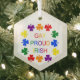 Cet ornement présente une image graphique d'une sélection de shamrocks de couleur arc-en-ciel encerclant un message de couleur arc-en-ciel qui dit "Gay Proud Irish". Le design s'adresse à tous les Irlandais LGBT qui aiment leurs racines irlandaises et sont fiers d'être gays.