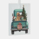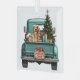 Un pick-up bleu turquoise porte un arbre de Noël décoré et des colis cadeaux sur ce joli ornement de Noël en verre. En regardant de la hayon arrière est un beau chien Golden Retriever. Un panneau en bois rustique sur le pare-chocs arrière dit "Cheer de Noël".