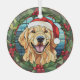 Voici un joli ornement de verre avec un thème de vitrail, avec un heureux Golden Retriever. Le chien porte un casquette du Père Noël rouge et blanc, avec un arrière - plan du ciel bleu. L'image est encadrée d'une jolie couronne verte et rouge cerclée de fraises. C'est une image haute résolution, de haute qualité, et fait un bon rembourrage ou décoration pour la maison qui aime un Golden!