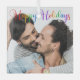 Elégant Happy Holidays photo ornement de Noël avec une belle typographie arc-en-ciel cursive. Ce cadeau de vacances LGBTQ moderne présente un script magnifique et votre nom en blanc sur la photo de fond d'un couple LGBT.