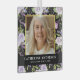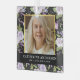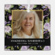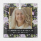 Élégant ornement commémoratif de Noël avec un arrière - plan noir élégant, d'élégantes fleurs d'aquarelle violette, une photo de votre être cher dans un cadre faux or, leur nom, et les dates de naissance et de mort.