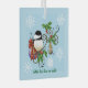Joli poulet assis sur une branche d'arbre en hiver avec des flocons de neige tombant tout autour. Les ornements de Noël pendent de la branche d'arbre sur laquelle le poulet est assis.