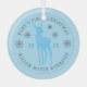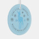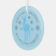 Un ornement moderne bleu bébé poussiéreux pour le premier Noël de bébé personnalise avec le nom du bébé, année, cerf avec un arc, des flocons de neige et des lettres de courbure en serif.